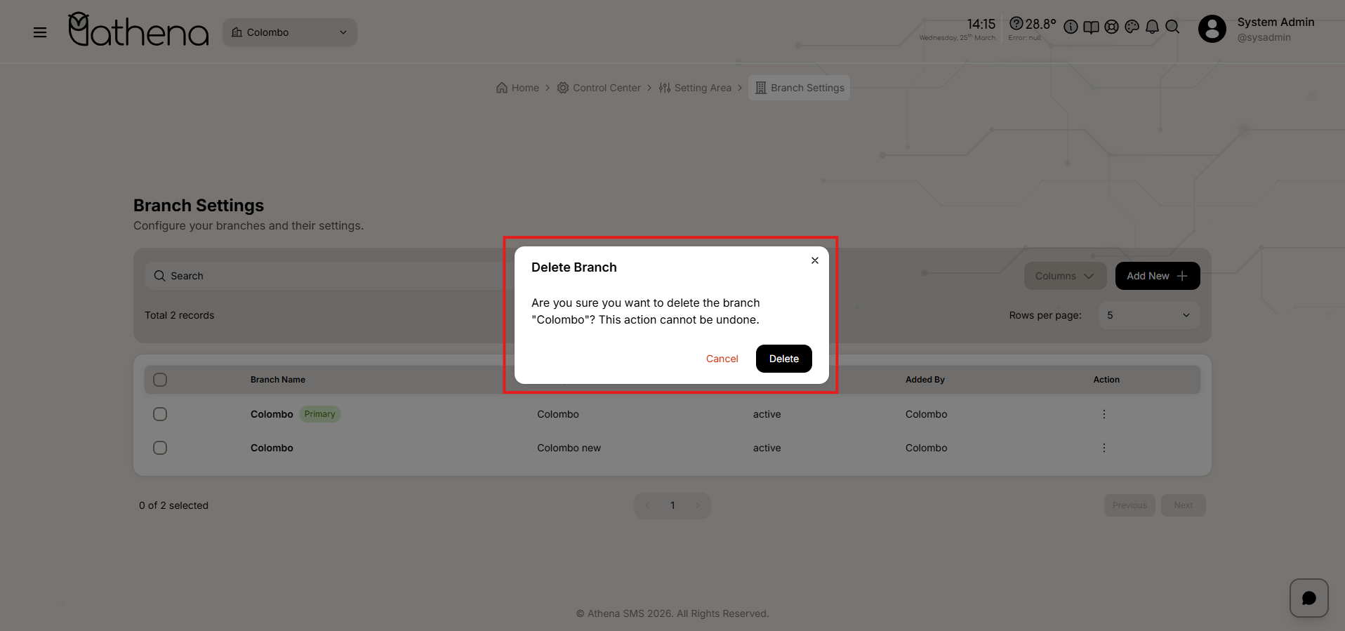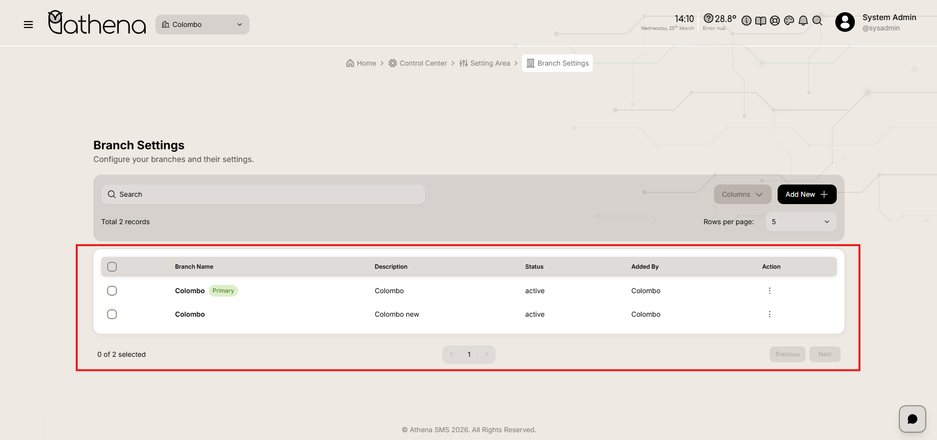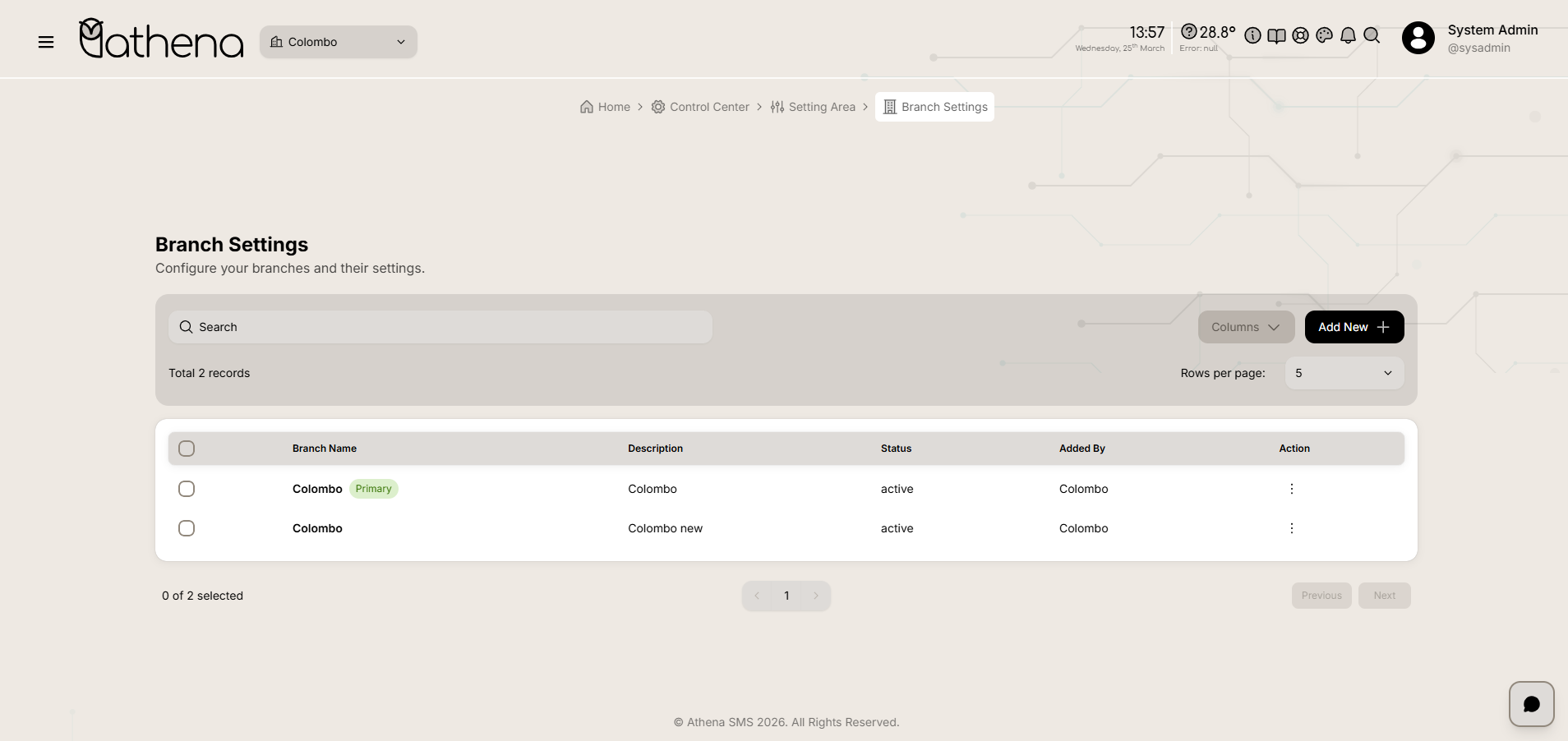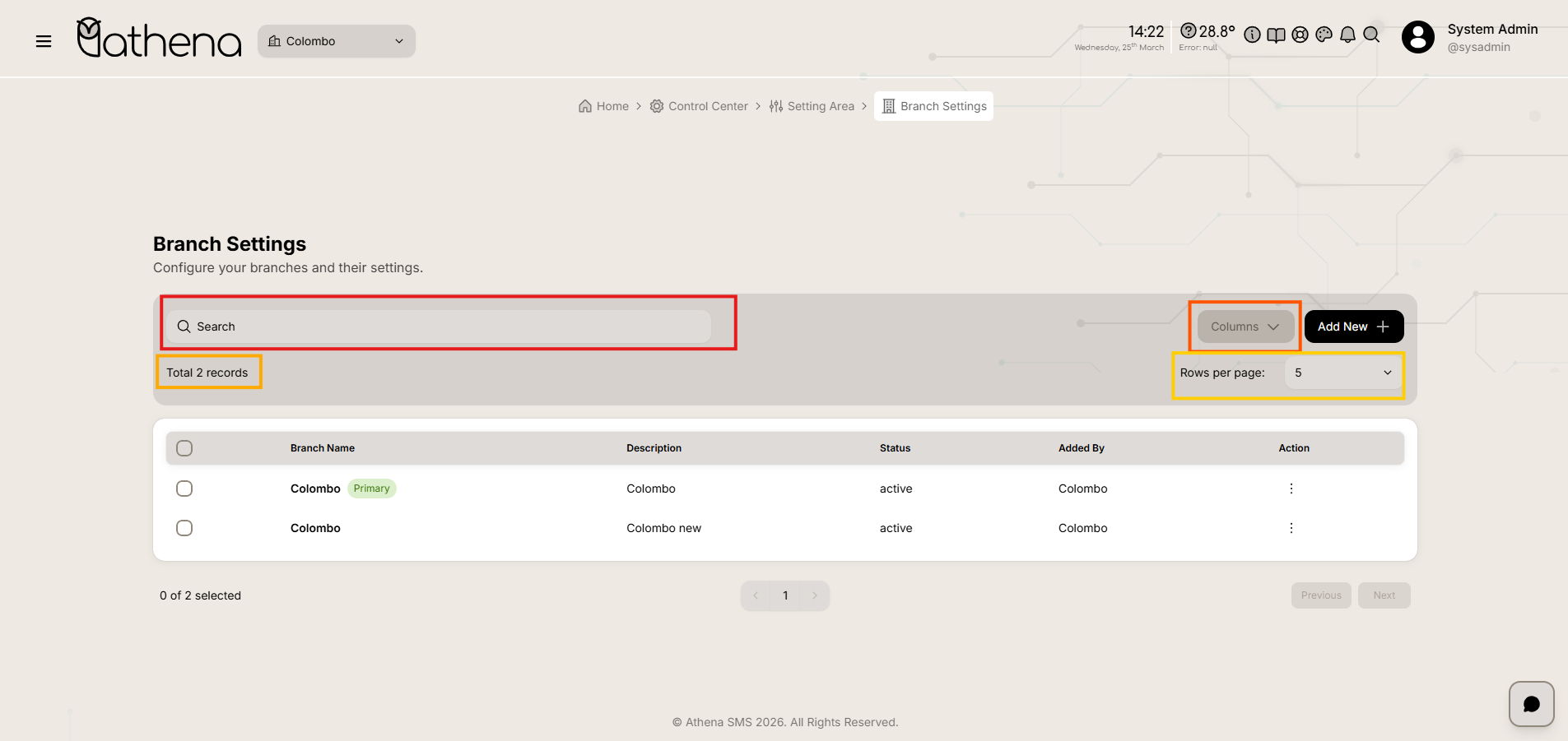Records Count โ Displays the total number of branches available, such as 2 records.