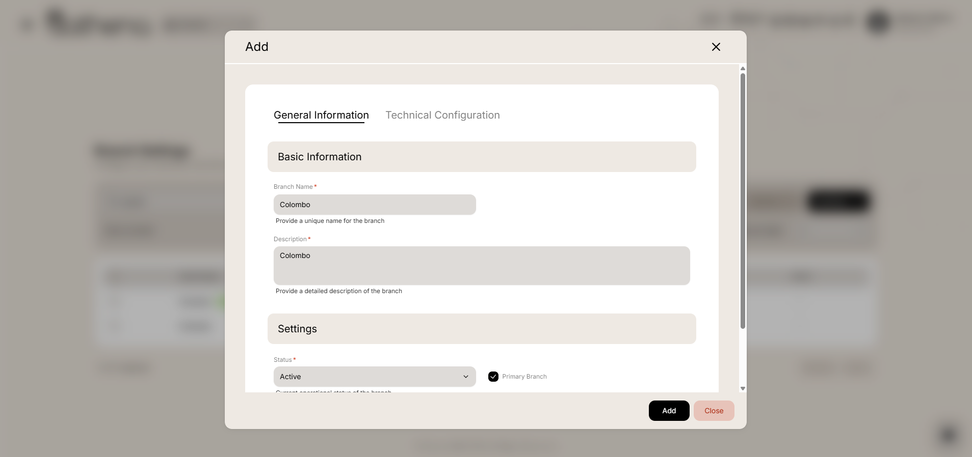 Basic Information - Enter branch name, description, address, contact details, and other foundational information.
