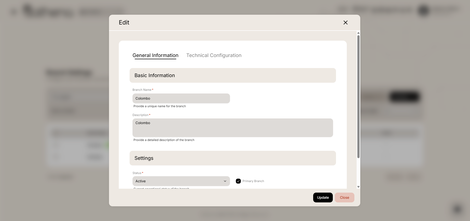 Complete Branch Configuration โ Configure basic information, primary branch designation, and technical settings in one place.