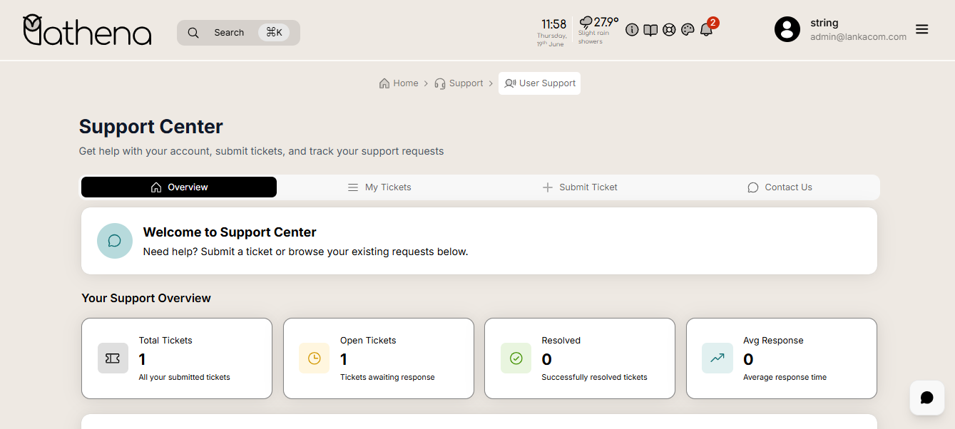 Overview β Gives a quick snapshot of total, open, and resolved tickets, along with average response time and quick access to support actions.
