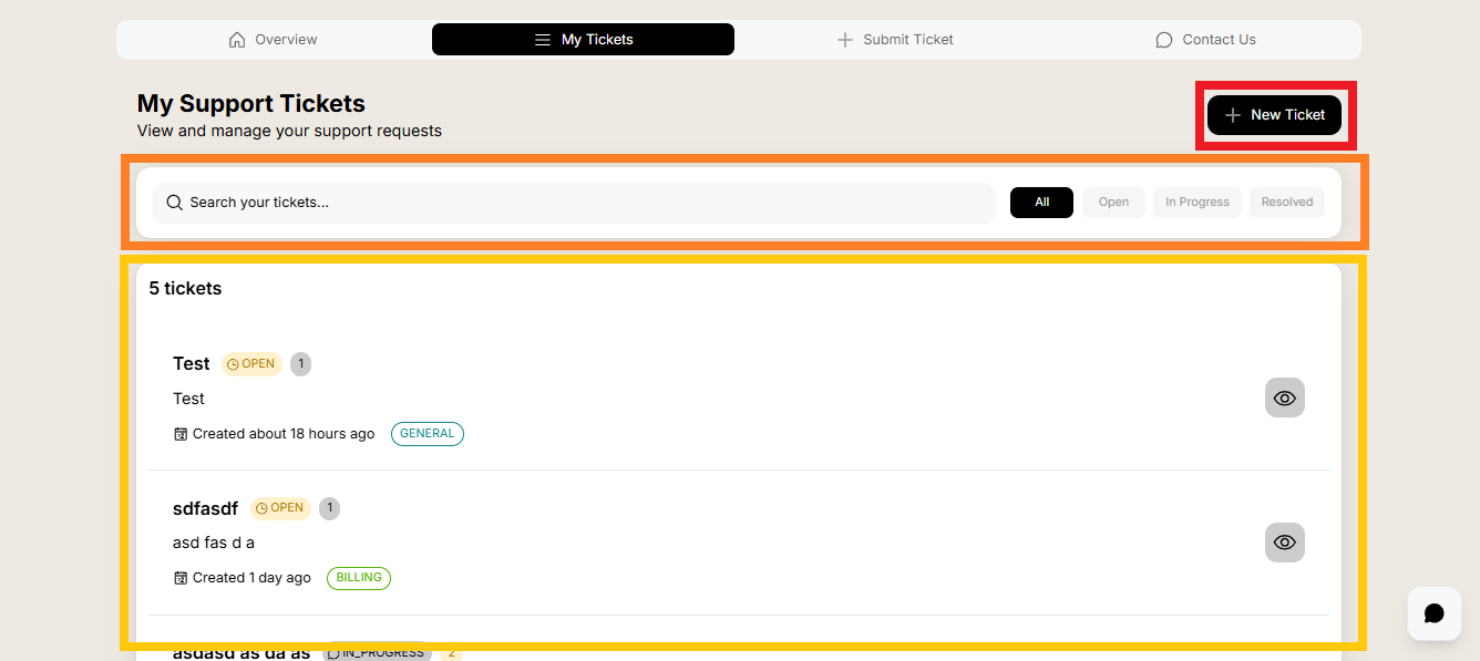 Search & Filter β Search and filter your tickets using the search bar or filter tabs: All | Open | In Progress | Resolved.