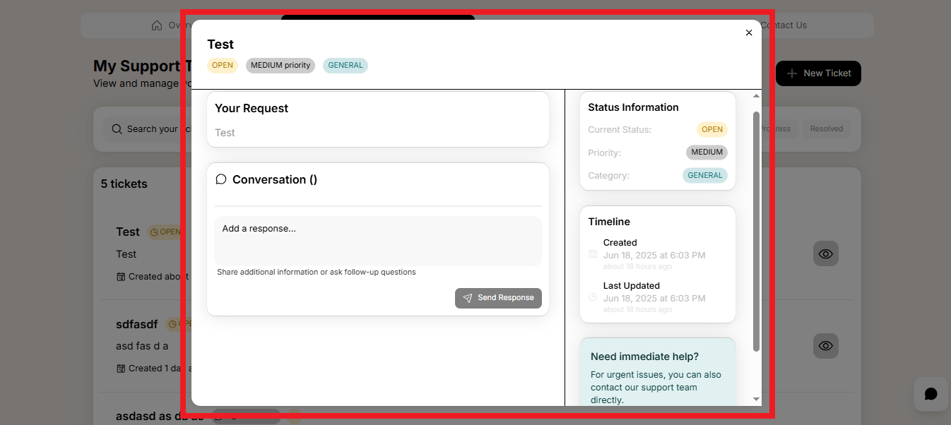 View Ticket - Clicking a ticket shows detailed info, including the subject, status, timeline, and a button to contact support.