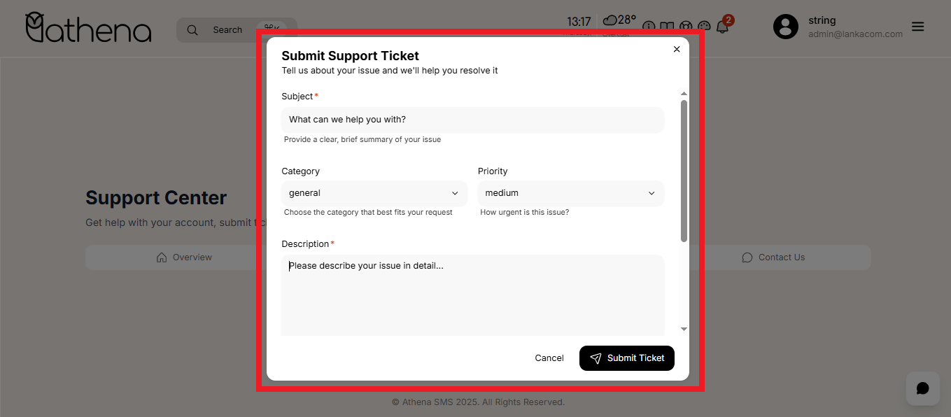New Ticket Button β Opens a form to create a new support ticket on Submit Ticket.