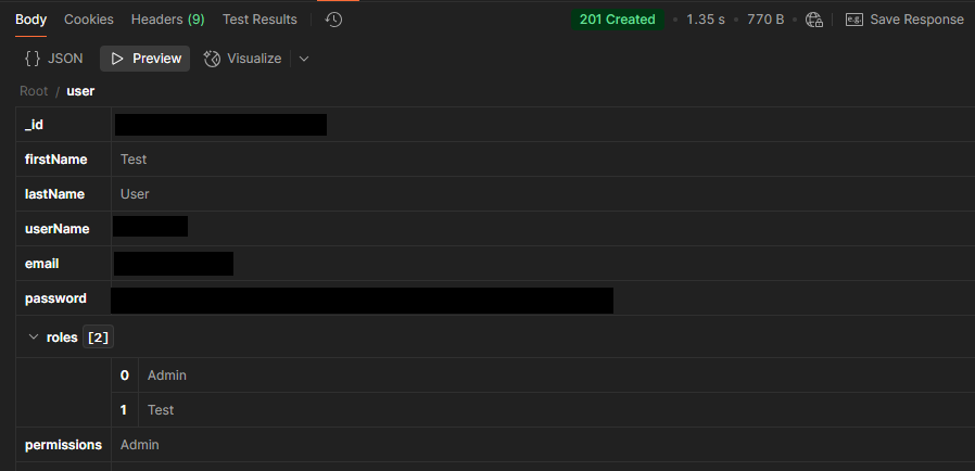 The API returned a success message confirming user creation.